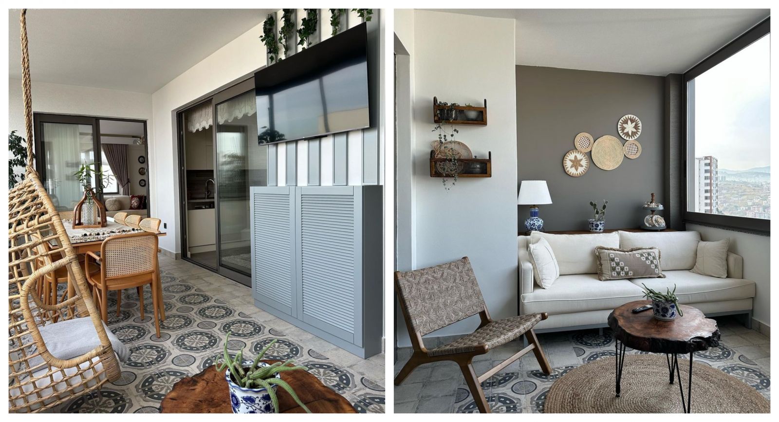 Kış bahçesi, Kapalı balkon, Beyaz, Hasır, Hasır sandalye, Balkon zemini, Balkon masası, Sandalye