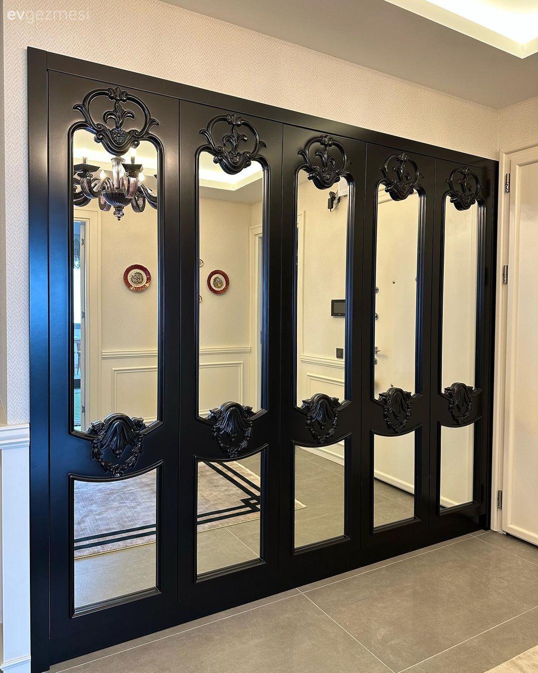 Evde antreden başlayan görüntüde neoklasik detaylar yer bulmuş. Dresuar ve vestiyer detayları buna uygun olmuş!