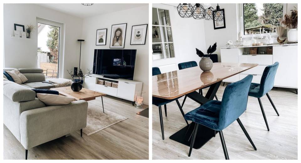 Mutfağın diğer tarafında yer alan salon için konforlu mobilyalar tercih eden ev sahibimiz, günlük kullanıma uygun bir alan oluşturmuş.