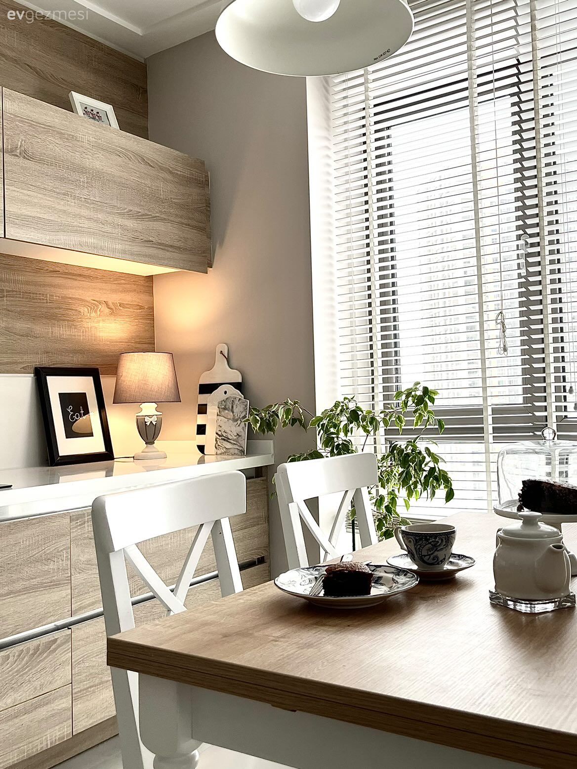 Mutfağını da bizimle paylaşan ev sahibimiz, burada ahşabın sıcaklığına başvurmuş. Yanına da yine beyazın ferahlığını eklemiş.