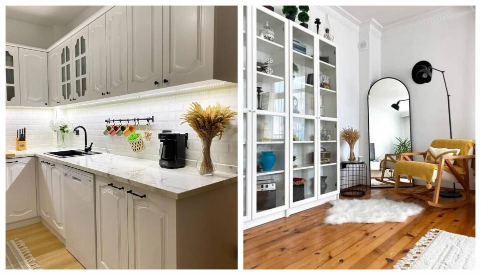 Salon ve yatak odalarını ayıran duvarda kullanılan raflar işlevselliğe iyi bir örnek.