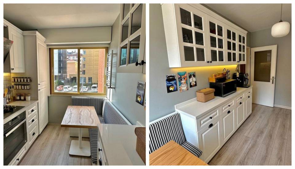 Girişin hemen sağında mutfak yer almış. U tipi plana sahip mutfağın devamı yemek bölümü...