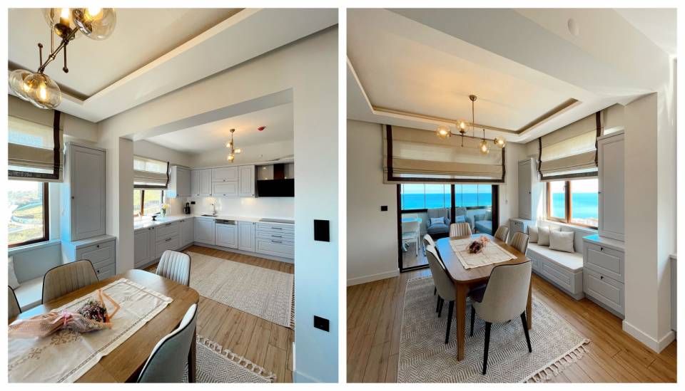 Beyaz shaker kapakların kullanıldığı mutfak genel olarak samimi bir atmosfer sunmuş. Çünkü alanda donuk bir görünüme sebep olacak hiçbir şey yer almamış.