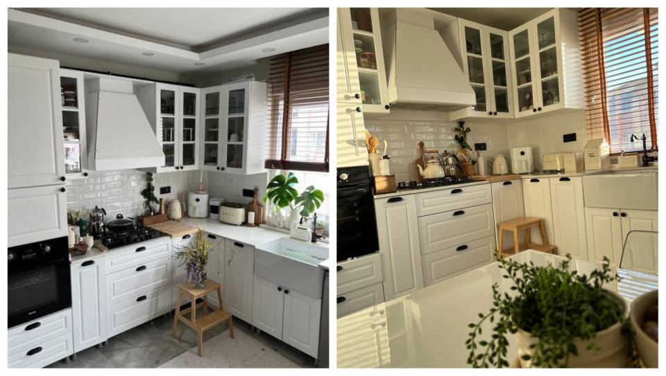 Bu harika mutfakta önce beyazın ferahlığı sağlanmış. Sonra da ortamı sıradanlıktan kurtarmak için bordo rengi devreye girmiş.