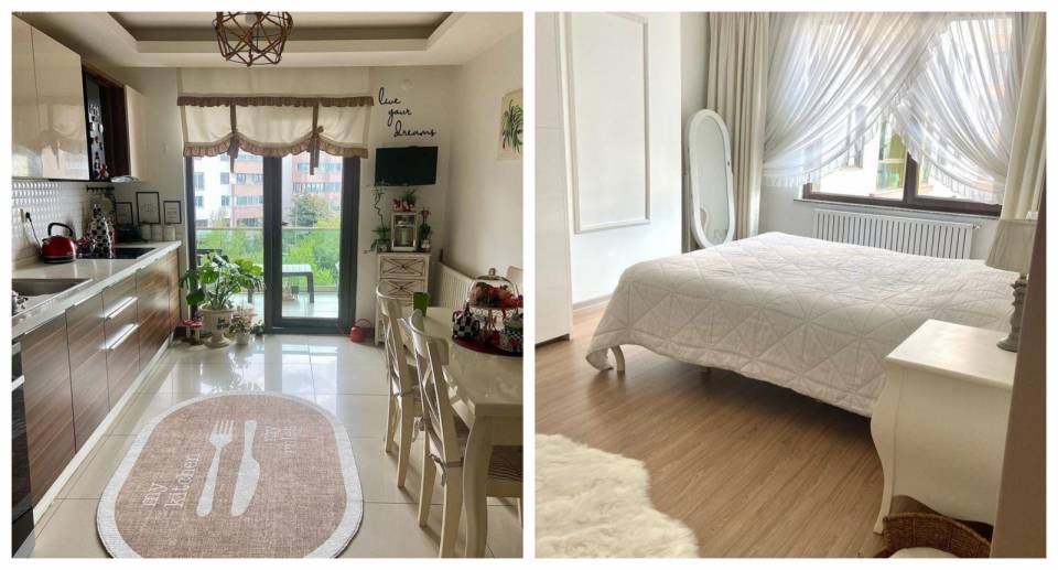 İskandinav stilin hakim olduğu mutfağında bizi ağırlayan ev sahibimiz, bu alanın geniş olması için balkon ile birleştirmiş.
