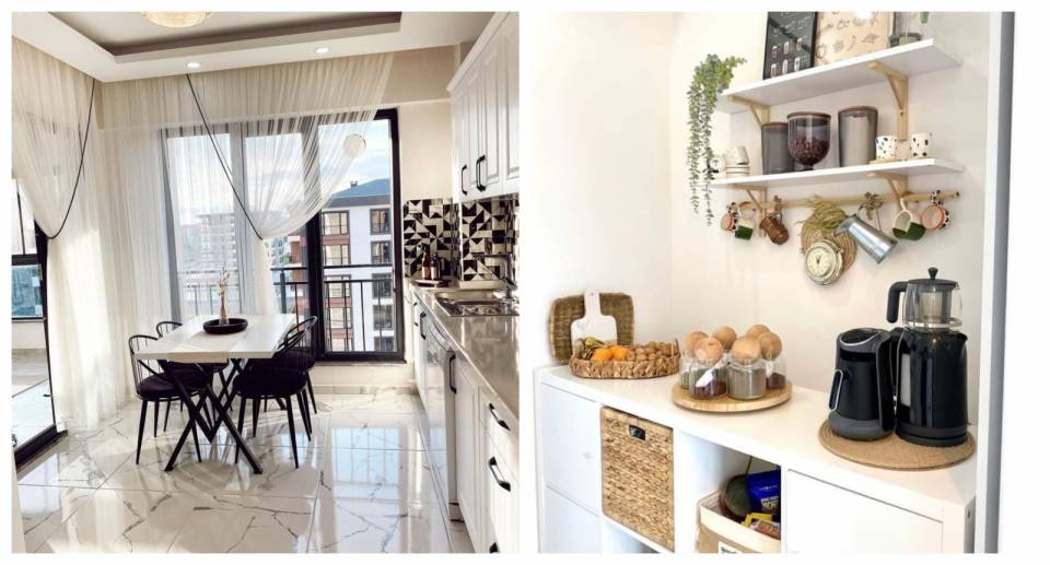 Mutfak, Beyaz, Gri, Siyah, Mutfak tezgahı, Mutfak tezgah arası, Ekstra mutfak dolabı, Mutfak aksesuarları, Kahve köşesi, Mutfak perdesi