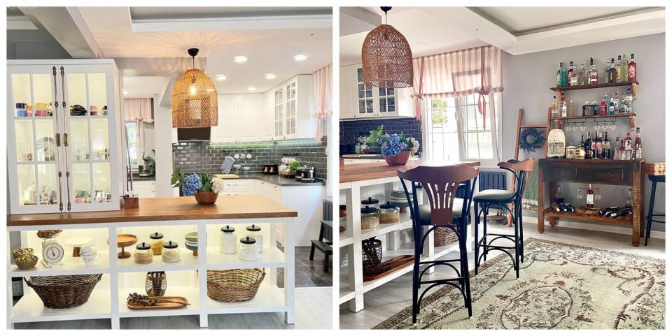 Eskiden beyaz ve ahşap renkli olan dolap kapaklarını yeni halinde tamamen beyaza çevirmiş. Tasarım olarak da shaker ve camın sıcaklığına başvurmuş.