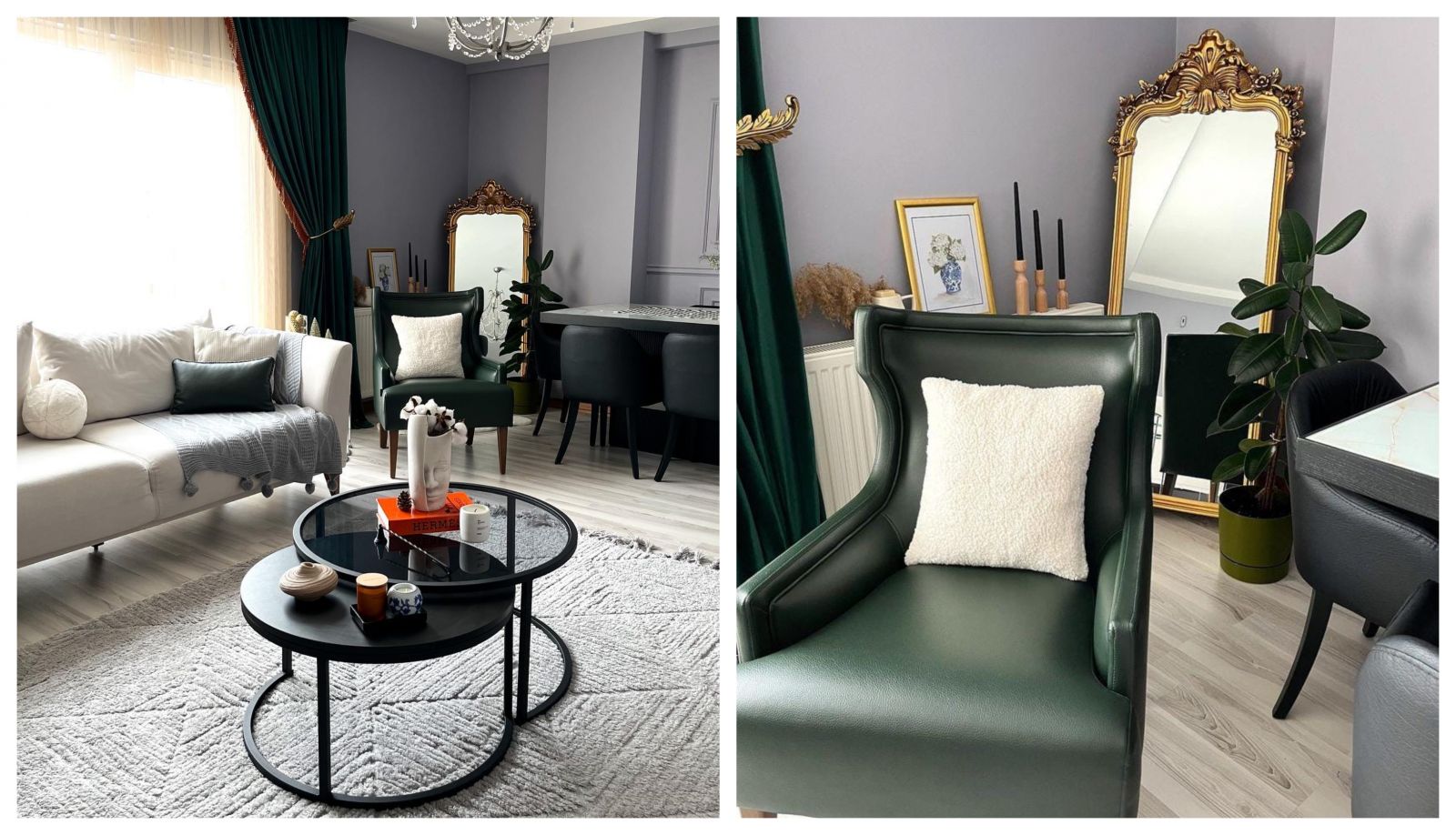 Modern stilin hakim olduğu salonda iki tane beyaz koltuk kullanılmış. Onları tamamlama görevini de yeil renkli nubuk berjer üstlenmiş.