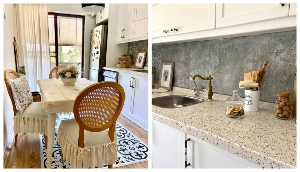 Yeşil ve ahşabın uyumunu ara sıra değiştirdiği kırlentlerle pekiştirmiş. Beyaz balon perdeler ve küçük kilimler de yerini alınca Zeynep Hanım için her şey tamam hale gelmiş.