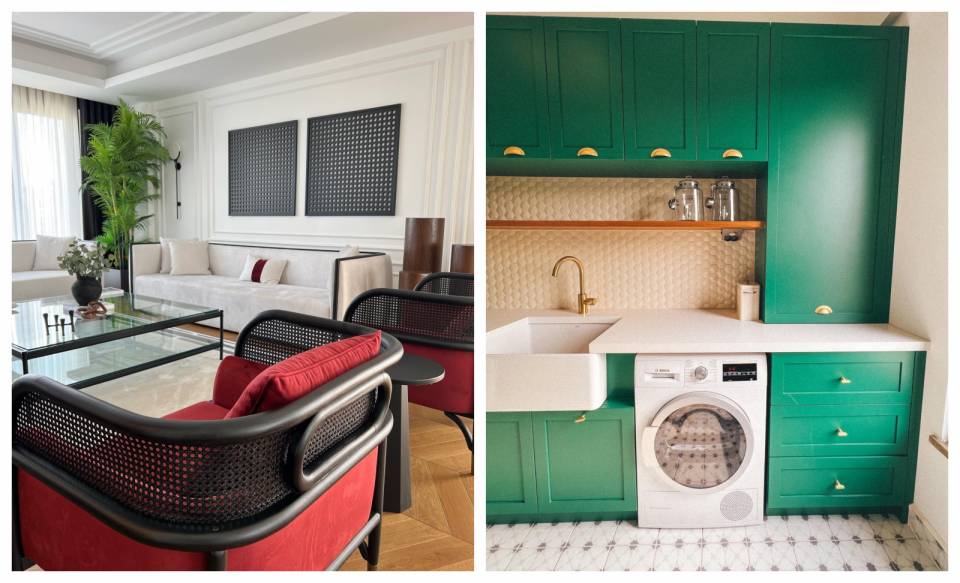 Beyazın yanına eklediği renklerde de genel olarak açık tonlardan gitmiş. Hareket noktası gerektiğinde ise sandalyelerdeki metal detaylar devreye girmiş!