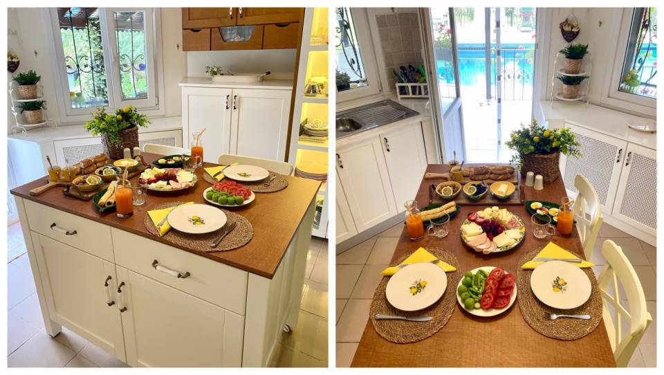 Mutfak adasının devamında konumlandırılan yemek bölümü iki pencere arasına konumlandırılmış.