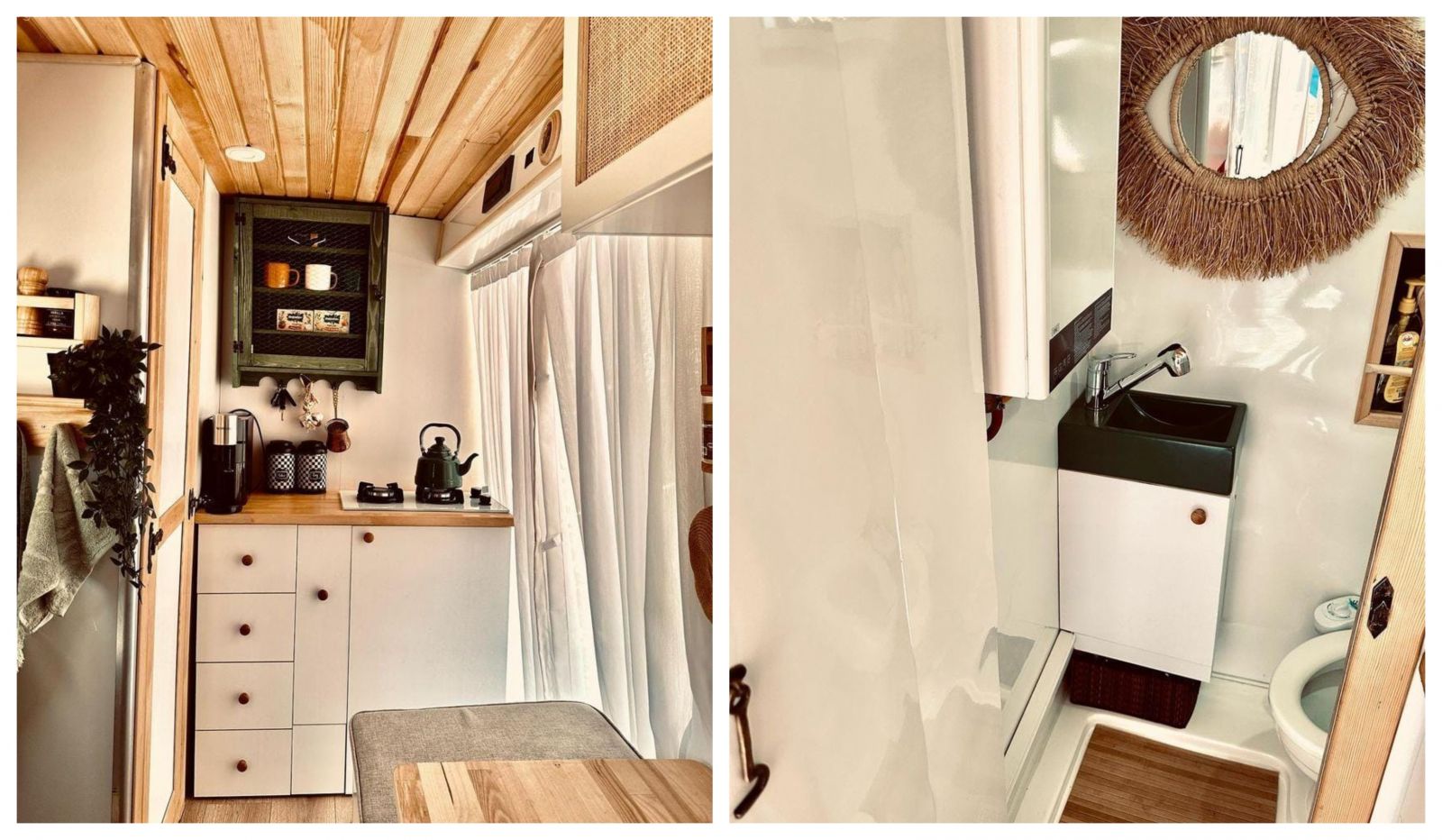 Karavanın ilk girişinde küçük mutfak ve yemek bölümü konumlandırılmış. Devamında da yatak! Banyo da ahşap bir kapı ile iç mekandan ayrılmış.