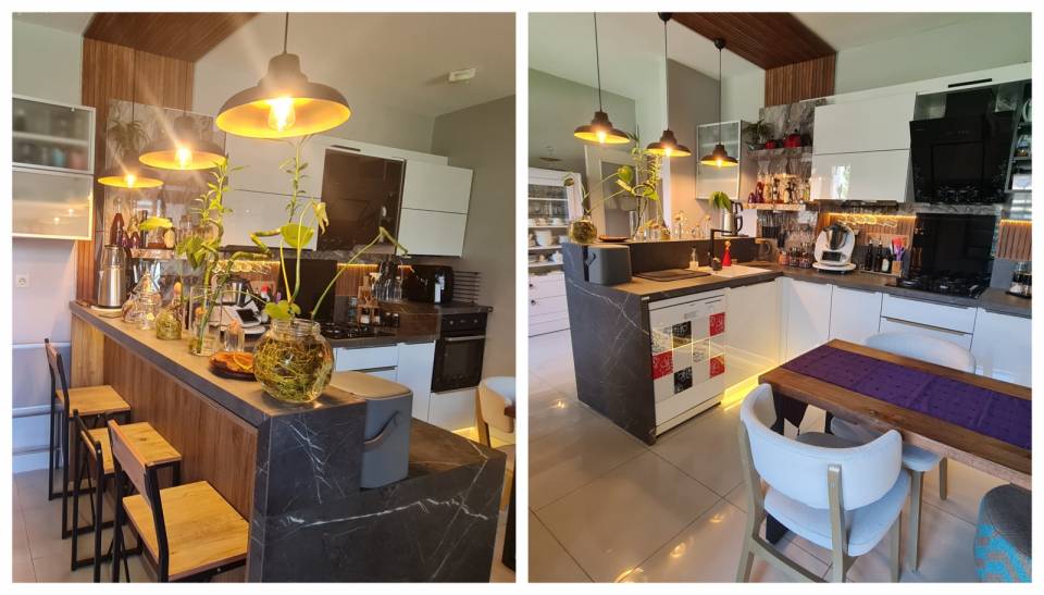 Tasarımlarıyla dikkat çeken bu mutfakta, dolap ve tezgah arasında kalan bazı yerlerde lambrilerden yararlanılmış.