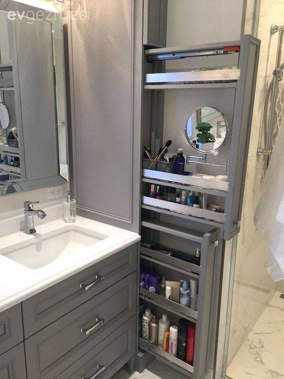 Beyazın ferahlığını yansıtan bu renkten sonra rezgah bölümleri de ahşap görünümlü folyo ile kaplanmış.