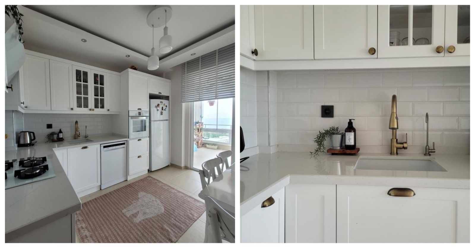 Boya ya da folyo gibi değişiklikler yerine yepyeni bir mutfak dolabı yaptrmaya karar vermiş. Bu noktada renk tercihi beyazdan yana olmuş.