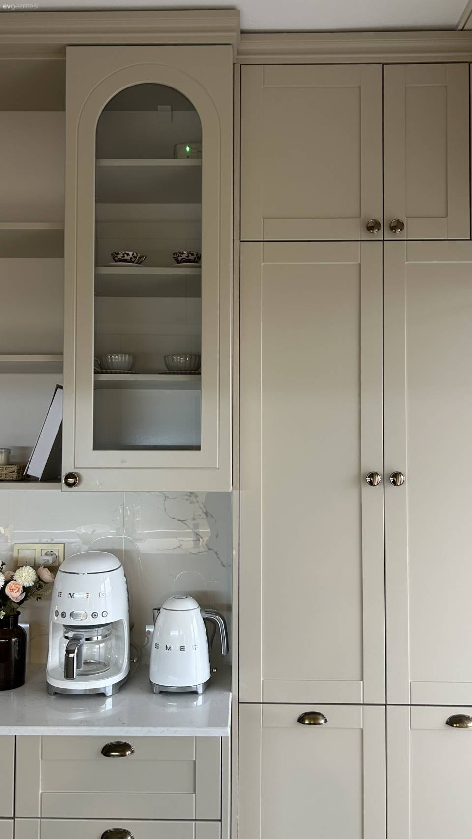 Mutfak da koridor tipi olduğu için bir tarafı tamamen beyaz renk kaplamış. Karşı tarafından da siyah seslenmiş.