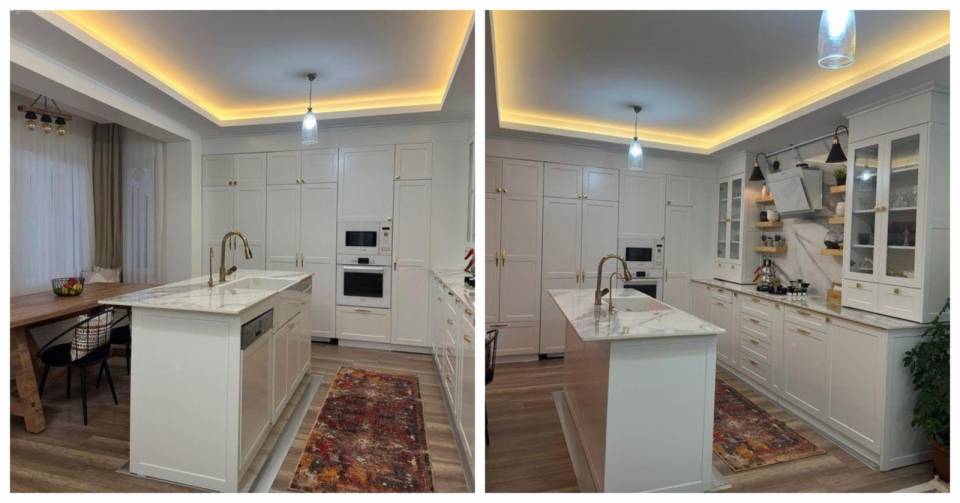 Evin tamamında kapsamlı tadilatlar yaptıran ev sahibimiz, yeni dolaplar yaptırmış. Birçok duvar da değişiklikten nasibini almış.