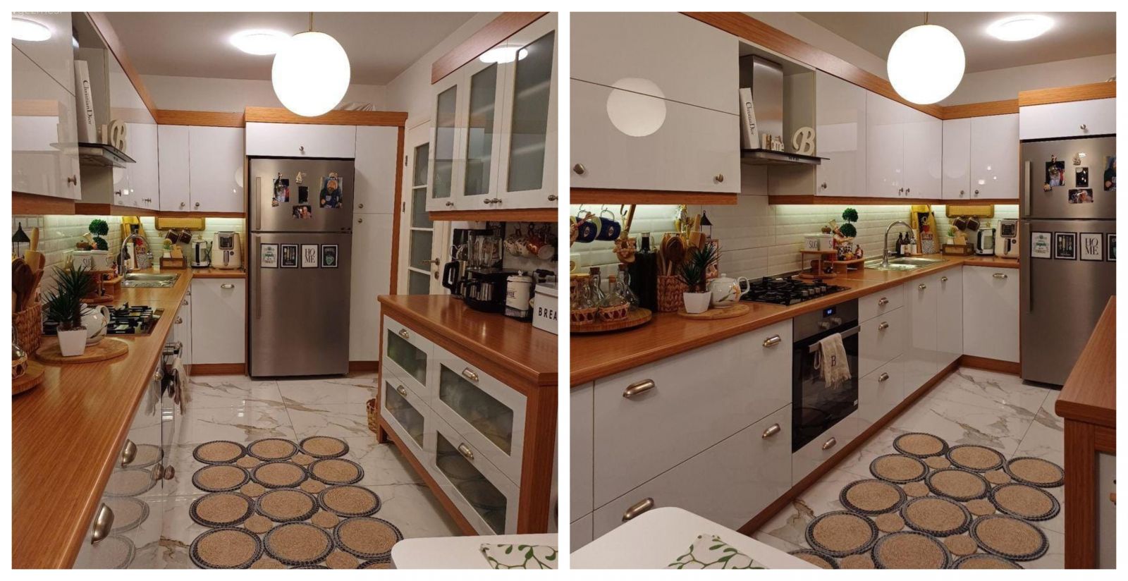 Mutfak, Beyaz ve ahşap mutfak, Ahşap mutfak tezgahı, Mutfak tezgahı, Mutfak tezgah arası, Mutfak halısı, Ankastre, Mutfak aksesuarları, Jüt halı, Halı