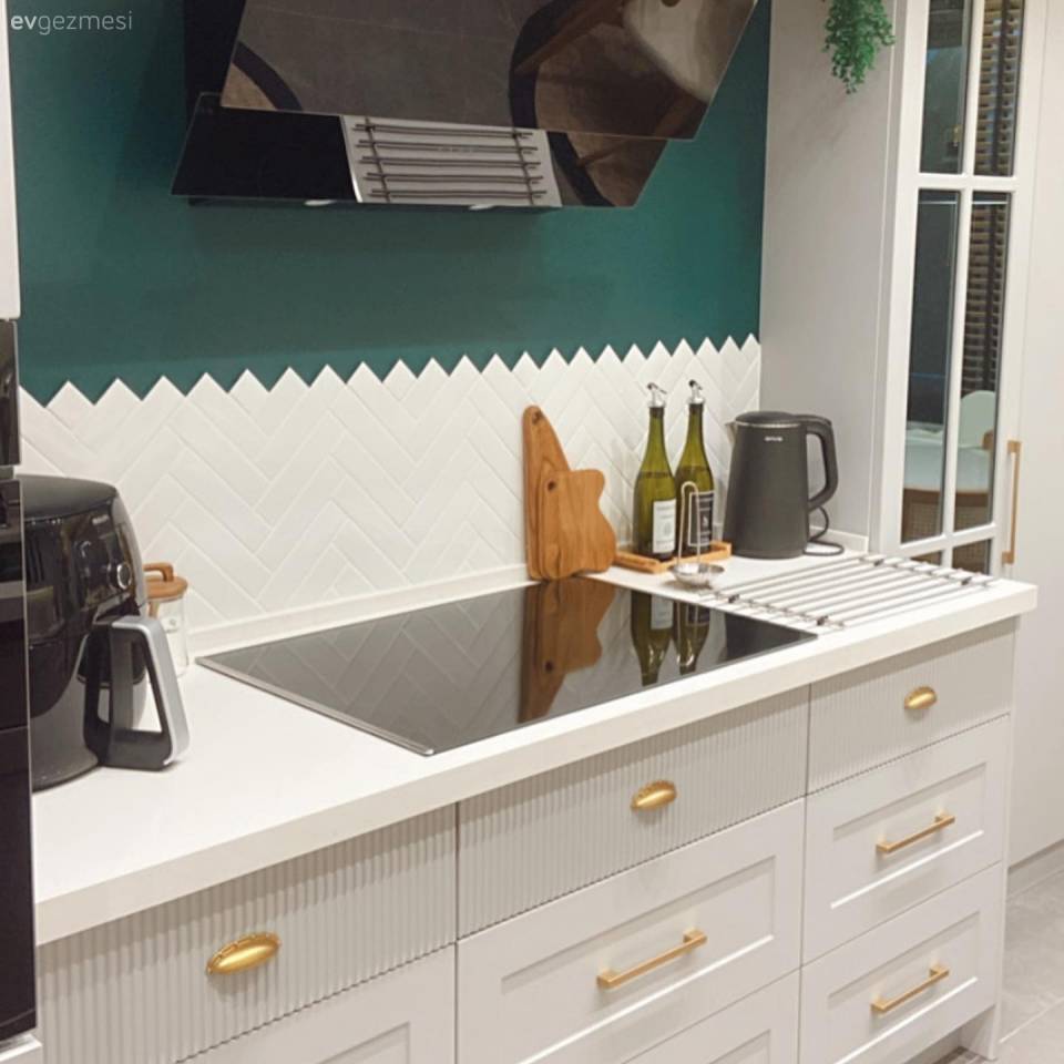 Alt katta yer alan diğer bir bölüm de mutfak! Modern stilin hakim olduğu bu alanda cappucino renkli dolaplar kullanılmış.