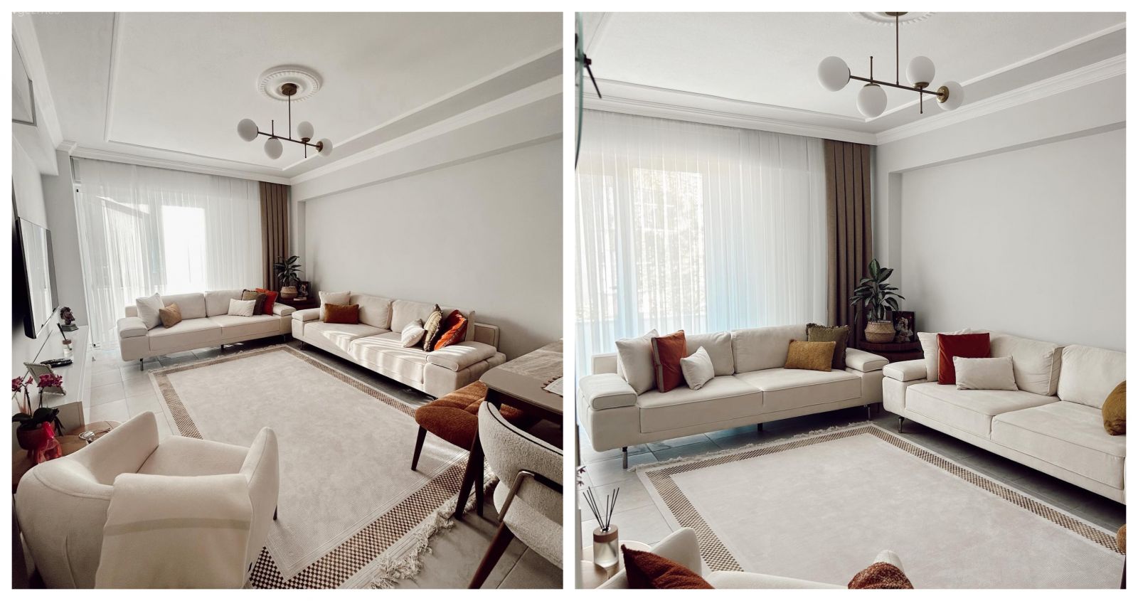 Salon, Modern, Beyaz, Bej, Kahverengi, Yanık turuncu, Koltuk takımı, Fon perde, Perde, Tül perde, Ev bitkisi, Salon halısı, Halı, Avize, Aydınlatma, Berjer, Sandalye, Yemek masası, Kırlent, Ev tekstili