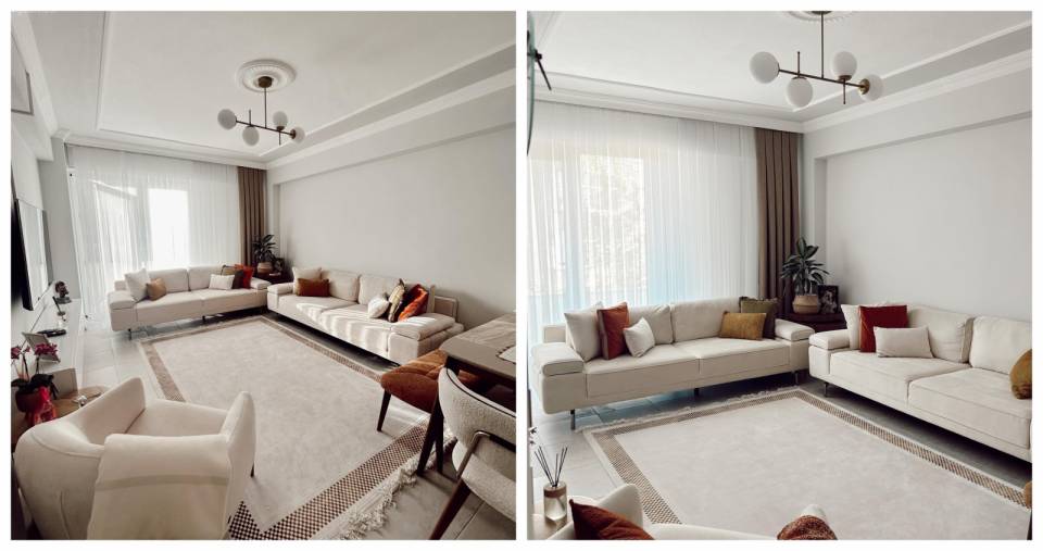 Modern, Salon, Gri, Köşe koltuk, Koltuk takımı, Fon perde, Perde, Tül perde, Halı, Salon halısı, Ahşap Mobilya, Berjer, Kırlent, Ev tekstili, Duvar dekorasyonu