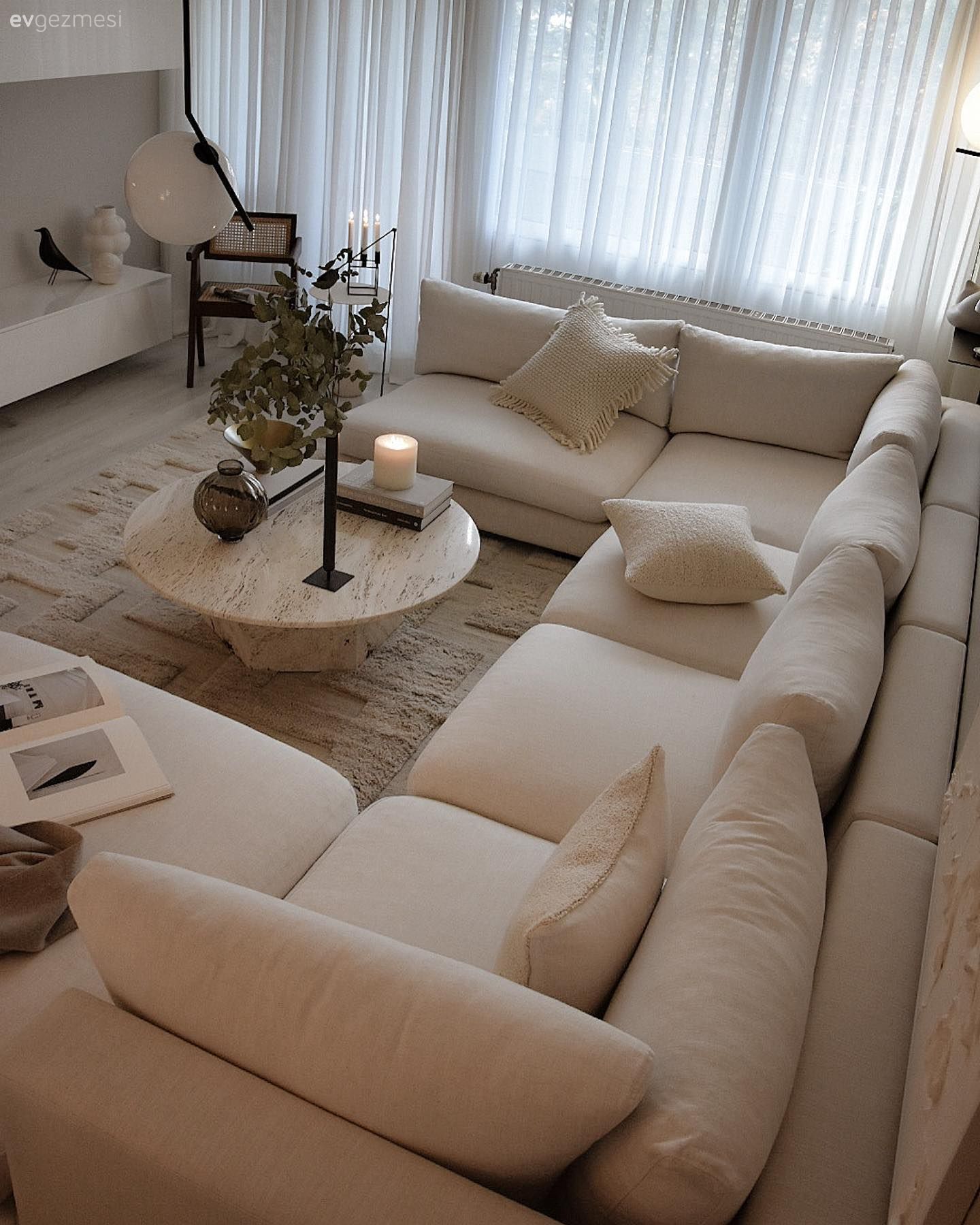 Koltuk, halı ve tamamlayıcılar beyazın ferahlığına teslim olmuş. Ortamı hareketlendirmek için siyahın kontrast sesine detaylarda yer verilmiş.