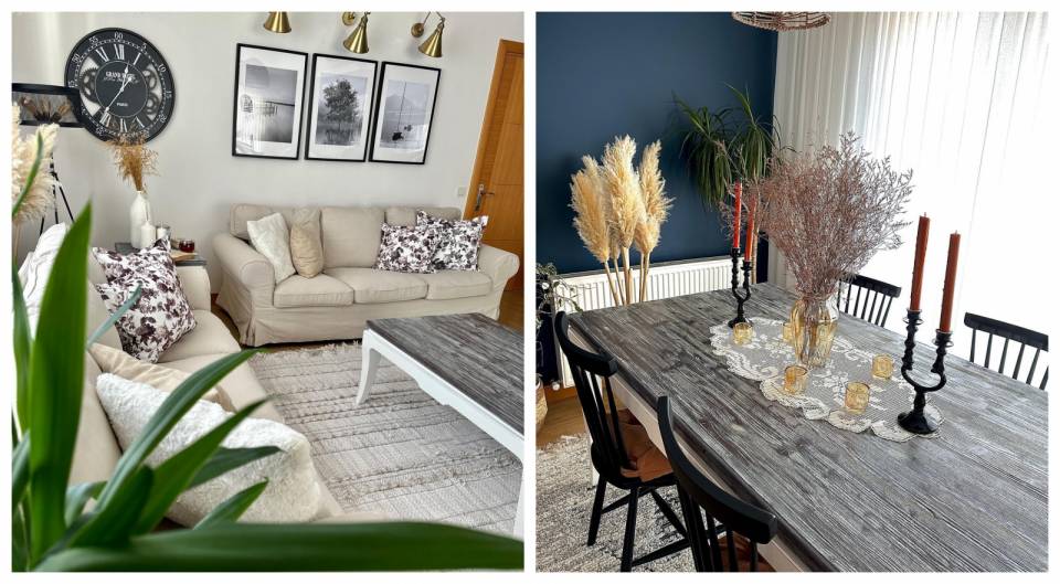 Bohem ve country tarzın hakim olduğu evde, salon bohem taraf olmuş. Mutfak da country esintileri barındırmış.
