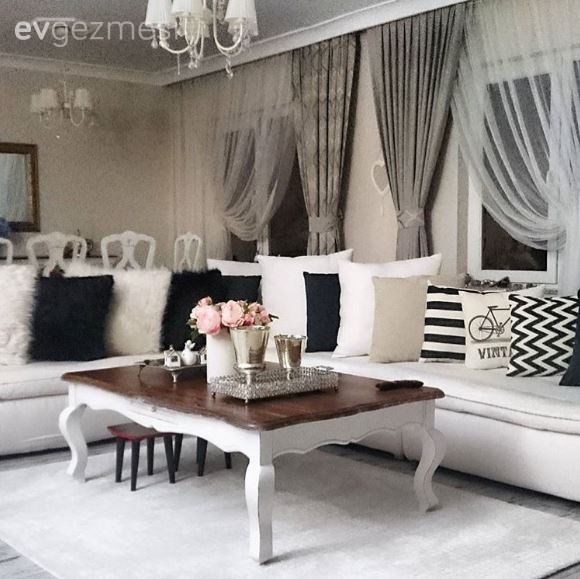 Bu sizin nasıl tarzdan hoşlandığınıza bağlı. Eğer İskandinav tarzı bir oda istiyorsanız, koltuğunuzda mat kadife ve koltuğunuzla birebir aynı renk kırlentlere, ayrıca tamamen ekru ve kahverengi payetli kırlentlere yer açın. Bunların arasına siyah peluş kırlent yada bir tane boyuna çizgili veya siyah desenli kırlentler kullanarak daha da hareketlendirebilirsiniz. Kolçak üstüne koltuk şalıda hoş duracaktır. Duvarınızda enlemesine gümüş çerçeveli bir ayna, odaya derinlik katacaktır. Halınız yarı tüylü, bunu dengelemek için kapı eşiğindeki paspas yerine peluş post kullanın. (Gerçek olmasın, karşıyız) Halınızı değiştirmek istiyorsanız tercihiniz yarı tüylü, krem rengi bir halı olsun. Halı üzerine dikdörtgen pleksi sehpa düşünün, sehpanızı gümüş sade ve şık objeler & canlı çiçeklerle donatın. İskandinav stilini yakalamış olursunuz. Tv üniteniz ve diğer mobilyalarınız ahşap olmalı.