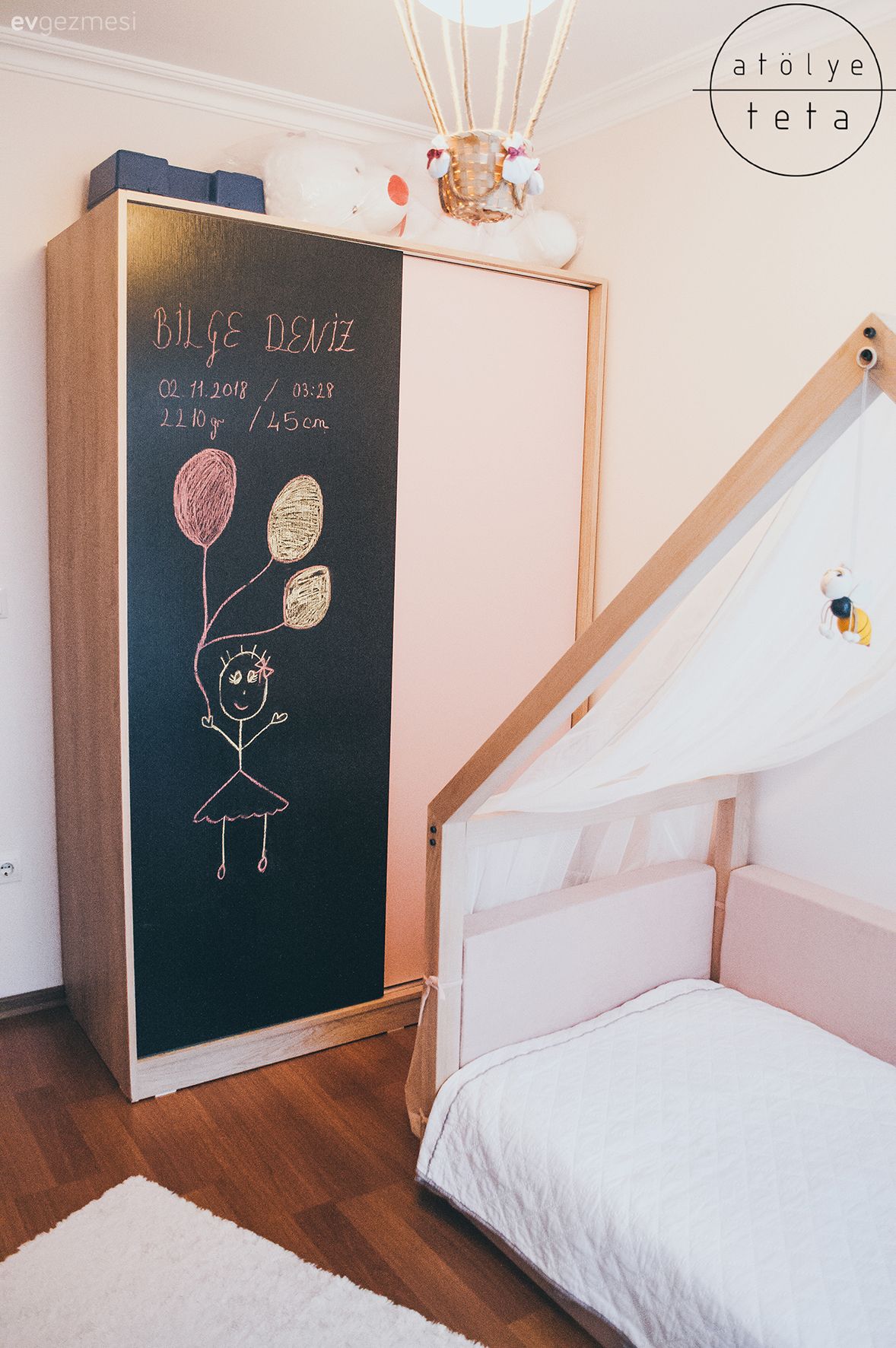 Mobilyalarını ona özel tasarlayarak ürettik. Odasının duvarları yerine istediği gibi boyayabileceği bir yazılıp silinebilen gardrop kapağı gibi detaylarla tasarımı zenginleştirdik.