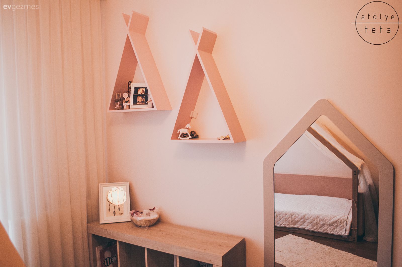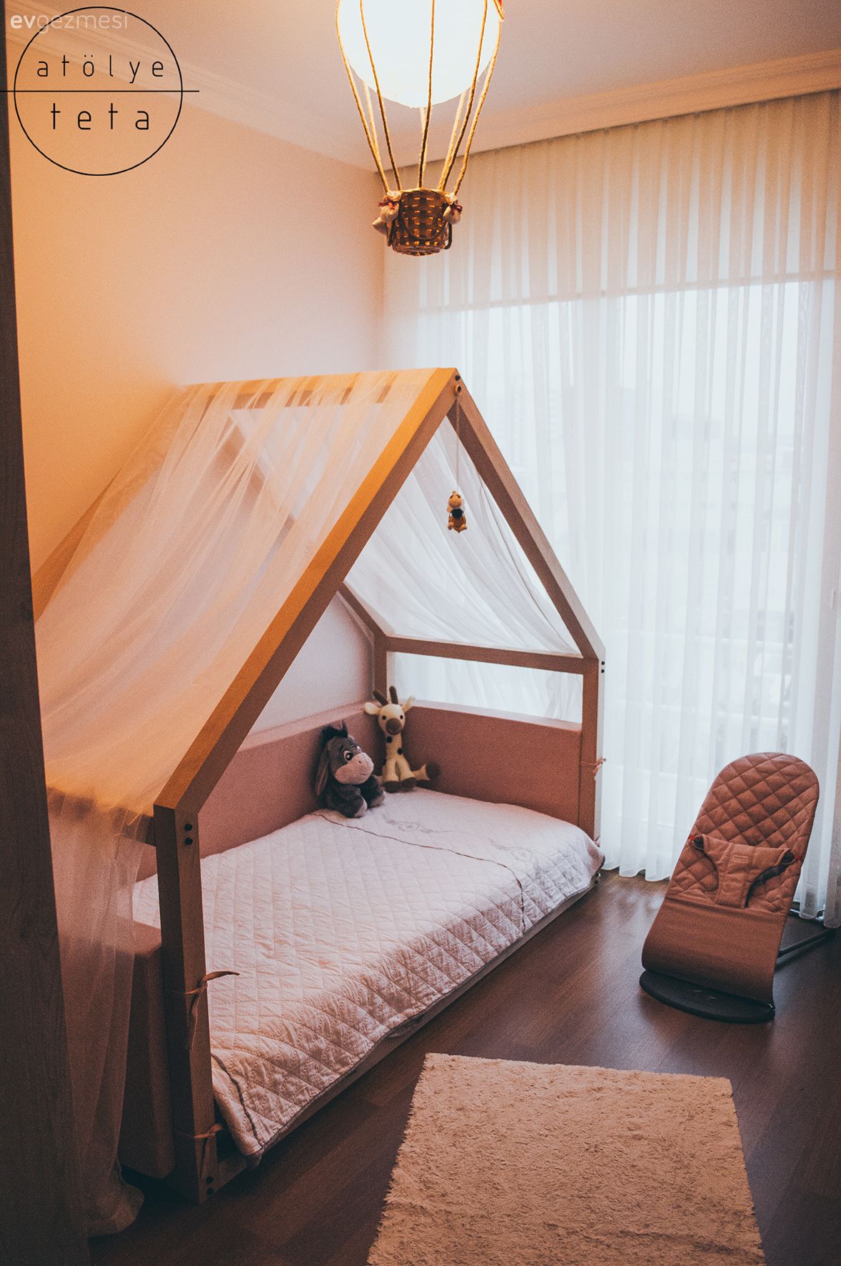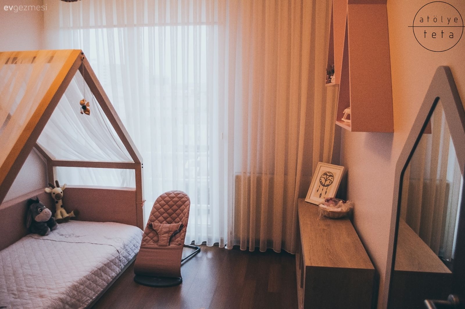 Bilge Deniz Bebeğin odasında, gelişimi için olması gereken tüm elementlerin olmasına özen gösterip, anne ve babasının ihtiyaçlarını da dinleyerek Montessori tarzında tasarladık.
