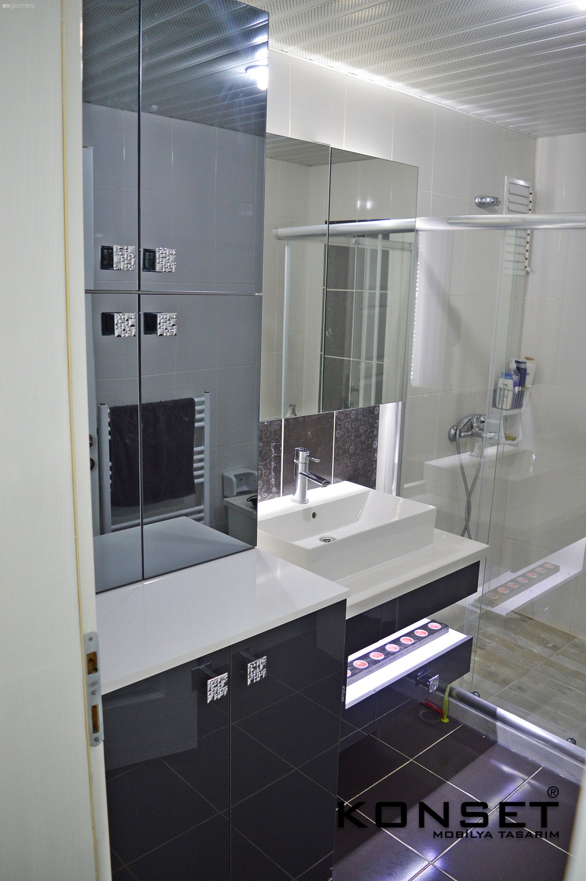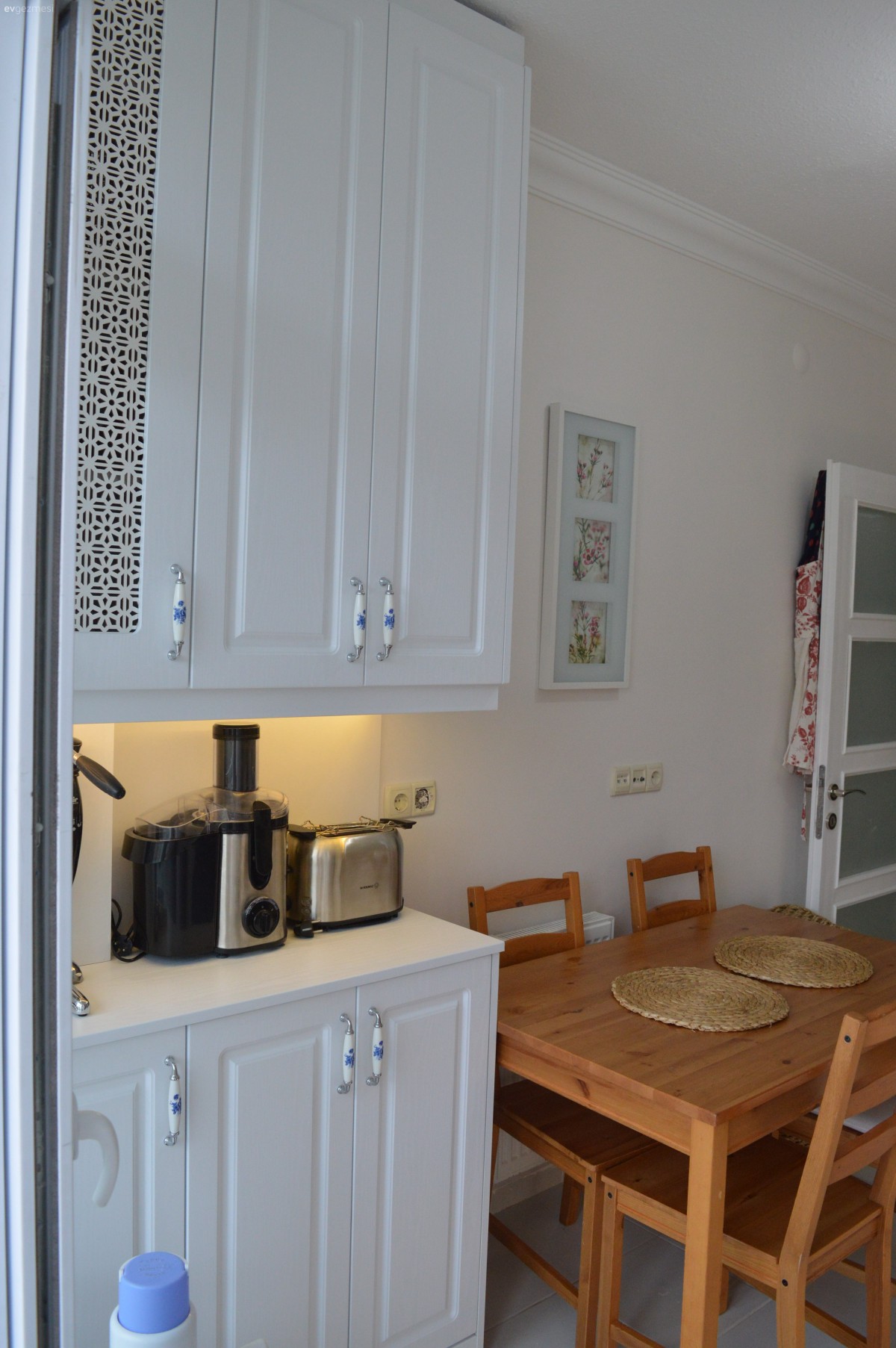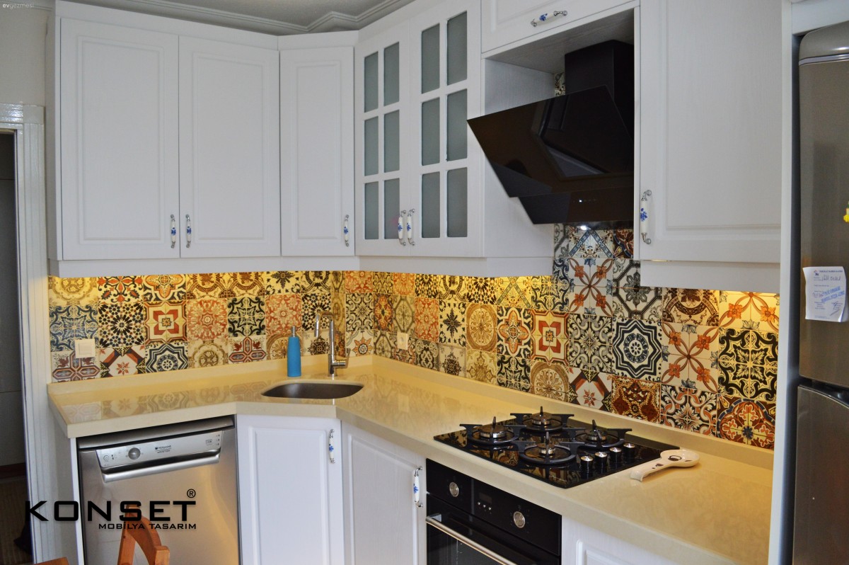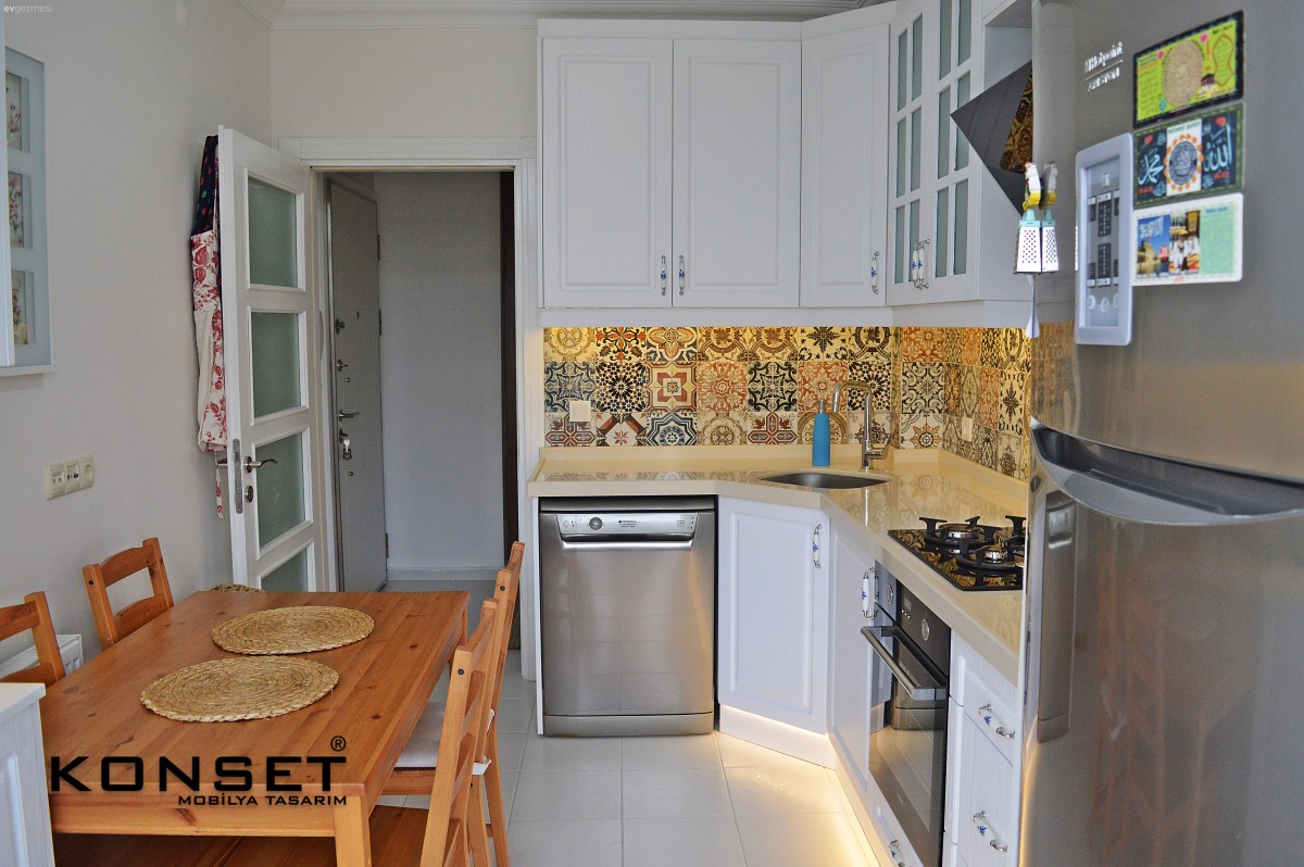 Beyaz renklerin hakim olduğu mutfak çalışmamız L şeklinde tasarlanmıştır.Tezgah olarak çimstone tercih edilmiştir.